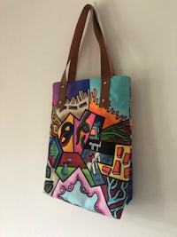 The Stained Glass Tote is composed with strong fabric and brown vegan leather.